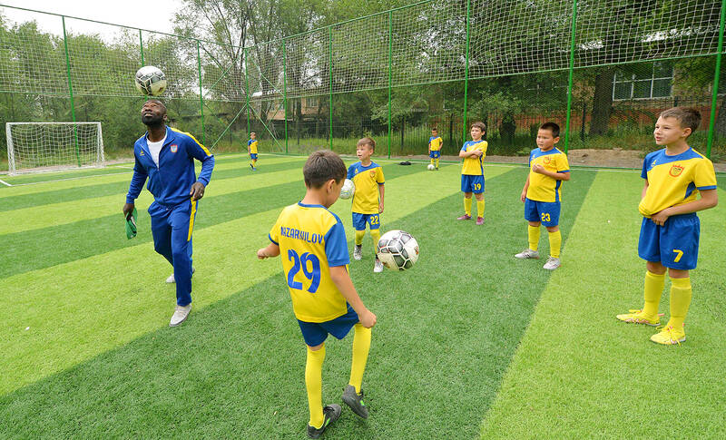 Former Kyrgyzstan player Daniel Tagoe, left, leads a training session for children in Leninskoye, Kyrgyzstan, on Tuesday last week.