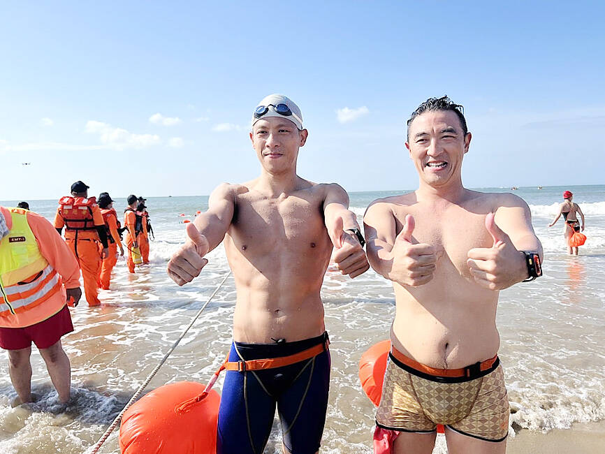 In its 11th year, the competition started at Xiamen’s Yefengzhai Beach and finished in Kinmen’s Lieyu Township, with a midpoint at Kinmen’s Binlang Islet, where the first swimmer in a two-person team handed off to a second swimmer.