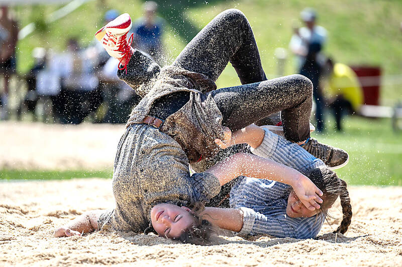 The Romanel women’s festival played out to up-tempo accordion music, occasionally interspersed with live yodeling. Following bouts, competitors gasped for air in the 32°C heat, then dunked their heads in a water trough. They faced six opponents throughout the day.
