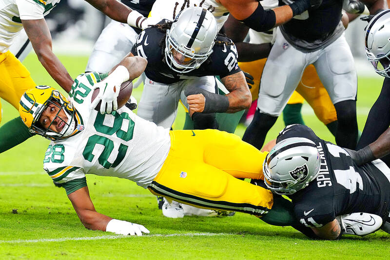 The Raiders’ offense did just enough, with Jimmy Garoppolo completing 22 of 31 passes for 208 yards and a touchdown while throwing his NFL-high seventh interception. Jakobi Meyers caught seven passes for 75 yards and a touchdown, and former Packer Davante Adams had four catches for 45 yards.