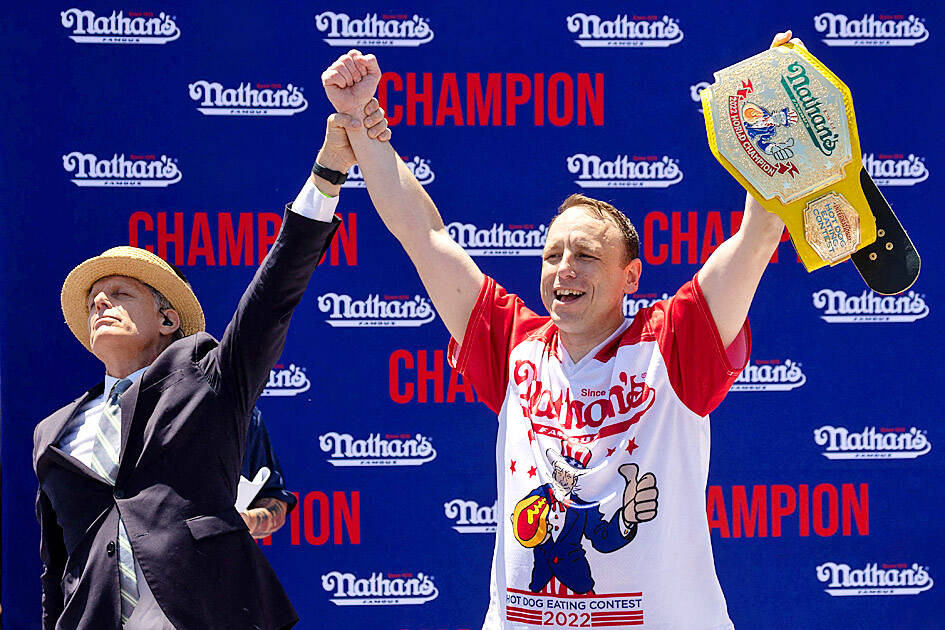 He has won the Nathan’s contest on July 4 — which draws thousands of fans each year — 16 times, including in 2021, when he set a world record by eating 76 hot dogs and buns in 10 minutes.