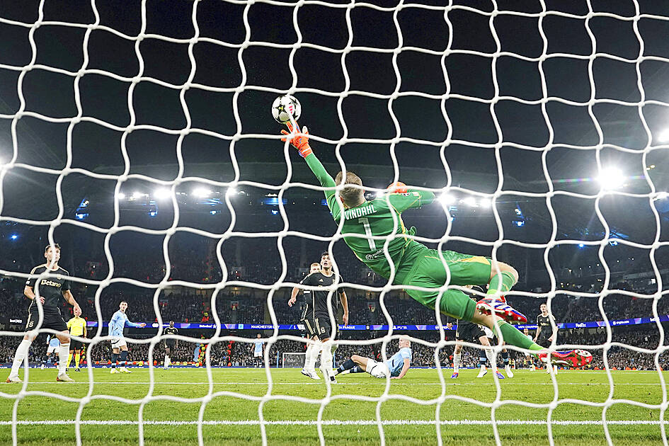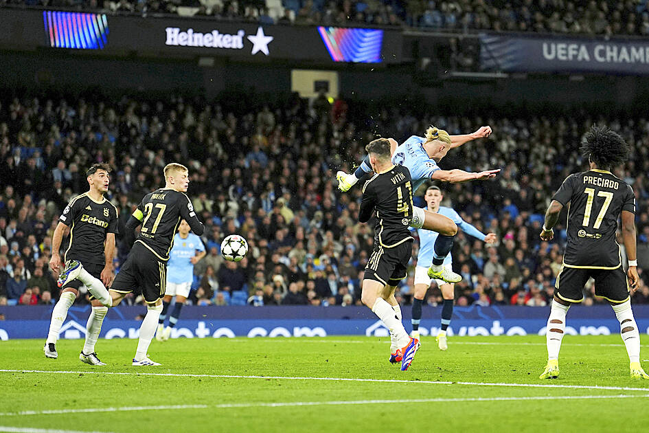 From about 6m and with his back to goal, the Norway striker leaped in the air and flicked the back of his foot to meet Savinho’s cross from the right. Connecting powerfully with his heel, the ball shot down into the turf and bounced high into the top corner beyond Prague goalkeeper Peter Vindahl.