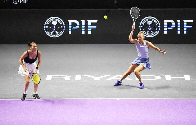 Taiwan’s Hsieh Su-wei, left, and Belgium’s Elise Mertens return to Australia’s Ellen Perez and Nicole Melichar-Martinez of the US during their women’s doubles round-of-16 match at the WTA Finals at King Saud University Indoor Arena in Riyadh on Saturday. Perez and Melichar-Martinez won 1-6, 6-1, 10-6.