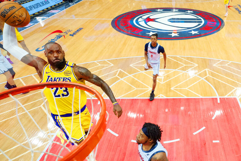 In Washington, LeBron James led from the front as the Los Angeles Lakers shrugged off the injury absence of Anthony Davis to thrash the Wizards 134-96.