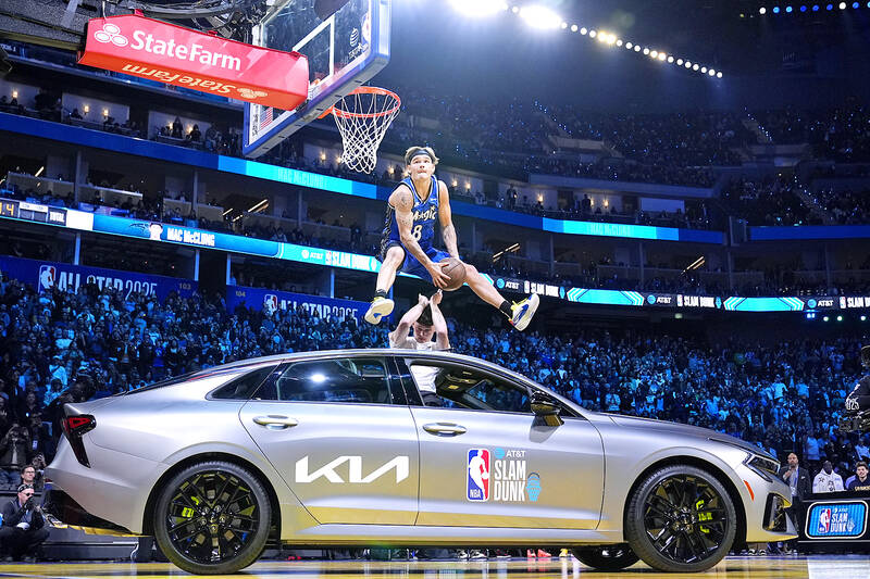 For his final dunk, McClung stationed 2.11m Evan Mobley on a platform in front of the basket. With Mobley holding the ball behind his head, the 1.88m McClung jumped over him, tapped the rim with the ball before slamming it home to the delight of the crowd and judges.