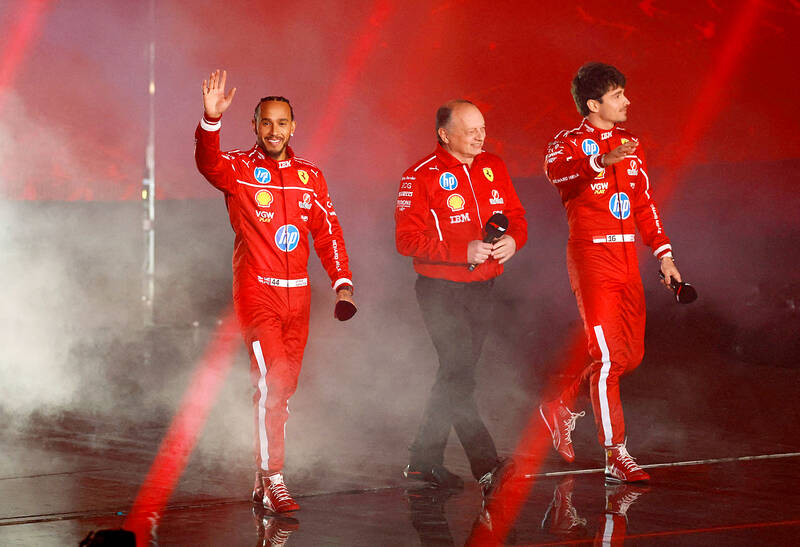 Seven-time world champion Lewis Hamilton appeared in Ferrari red for the first time outside of Italy as Formula One put on an unprecedented and spectacular 10-team season launch in front of 15,000 fans on Tuesday.