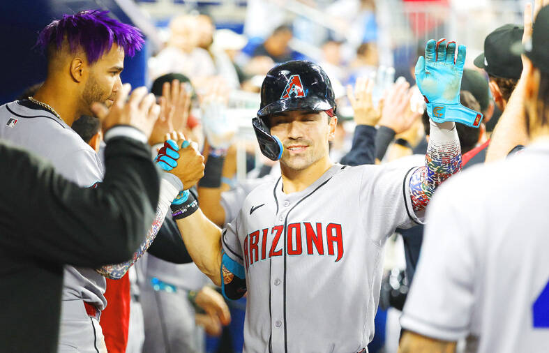 Taiwanese-American outfielder Corbin Carroll on Tuesday night slugged a grand slam and drove in five runs, leading the visiting Arizona Diamondbacks to a 10-4 win over the Miami Marlins.