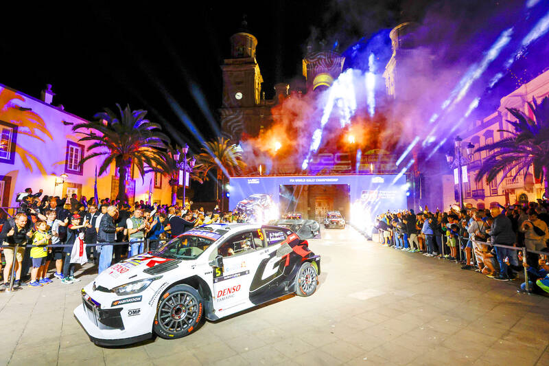 Finnish driver Sami Pajari of Toyota Gazoo Racing WRT drives his car at the start of the ceremony for WRC Rally Islas Canarias, at Santa Ana square in Las Palmas de Gran Canaria, Spain, on Thursday. Pajari placed fifth as of the third stage yesterday, 34.4 seconds behind the leader, Kalle Rovanpera.