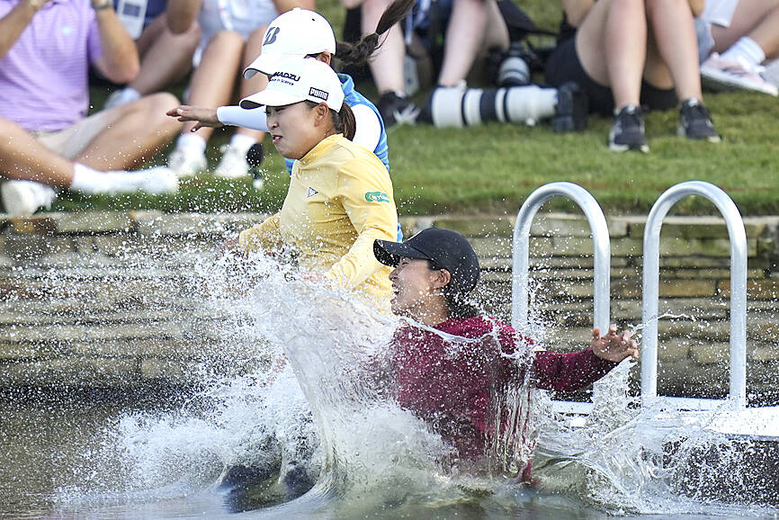 Saigo had more tense moments after the victory when she took the traditional winner’s leap into a pond.