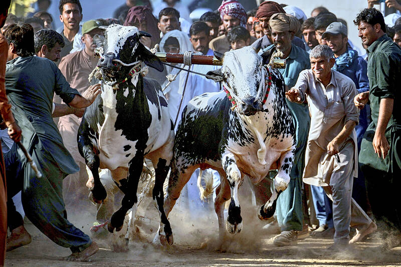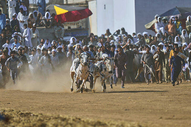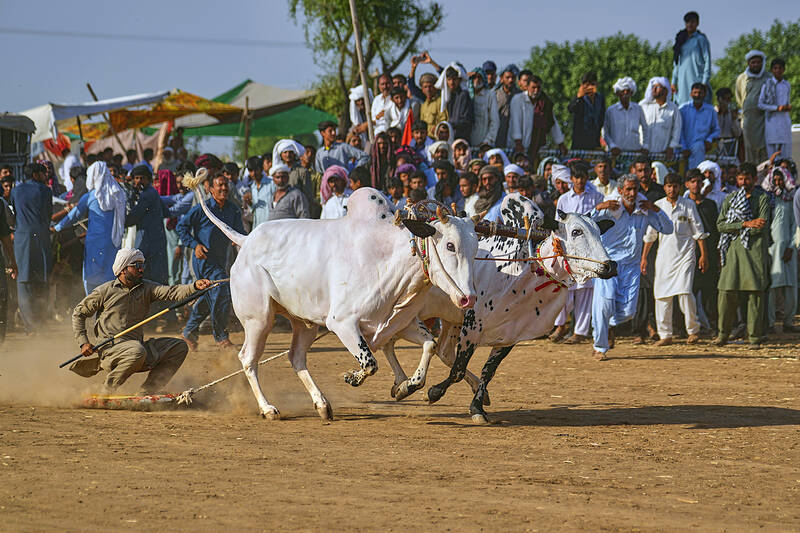 Bulls are yoked together by thick wooden frames in a sun-scorched field of rural Pakistan, while behind them, holding onto nothing more than ropes and his honor, is a man on a plank.