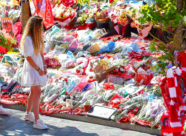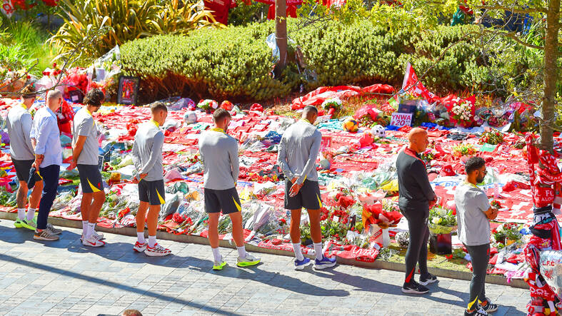 Somber training sessions have been followed by visits to the mass of bouquets and scarves left in tribute to Jota and Silva behind the main stand at Anfield.