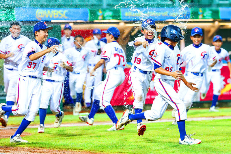 Players from Taiwan’s under-12 team on Tuesday celebrate their win against Mexico at the WBSC U-12 Baseball World Cup at the Tainan Asia-Pacific International Baseball Stadium. Taiwan won the Group A Opening Round clash 6-5. They finished third in the group to enter the Super Round alongside South Korea, Japan, Mexico, the US and the Dominican Republic. The hosts face the Dominican Republic today.