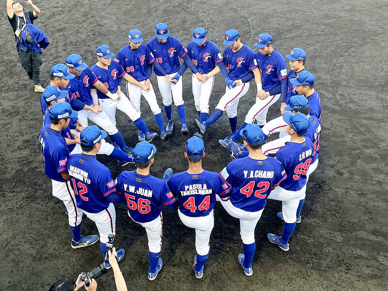 Taiwan’s players huddle up ahead of their Super Round game against South Korea at the WBSC U-18 Baseball World Cup at Nishizaki Stadium in Itoman, Japan, yesterday. South Korea won 8-1, while Puerto Rico beat Panama 3-1 and Japan downed the US 6-2 in the other Super Round fixtures. In the Placement Round, China downed South Africa 11-3, Italy triumphed over Germany 4-2 and Cuba beat Australia 2-1.