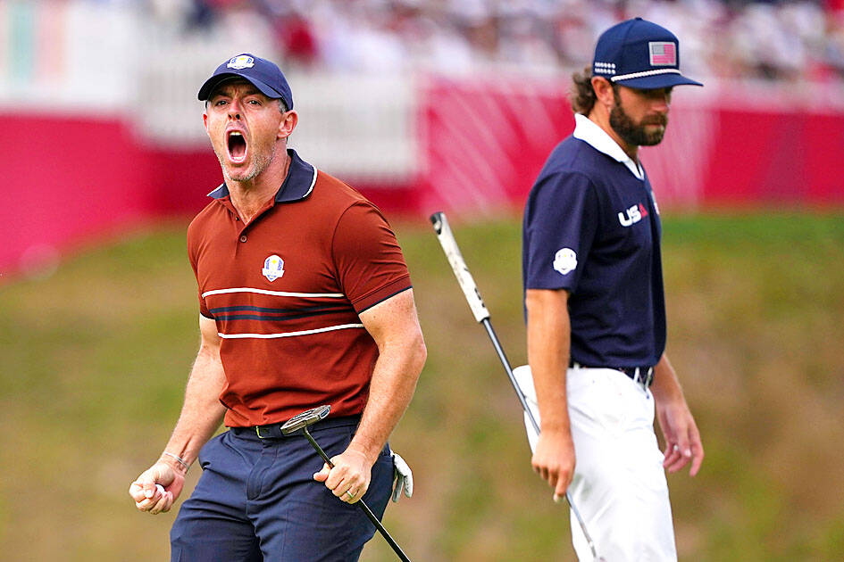 His second match — in which McIlroy paired with Shane Lowry for a 2-up win over Justin Thomas and Cameron Young — was a foul-mouthed medley of over-the-top, fist-pumping celebrations punctuated by a steady stream of insults and chants of “Ror-reeee, Ror-reeee, Ror-reeee” coming from every corner of the golf course.