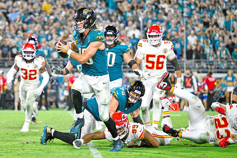 Jaguars quarterback Lawrence’s winning touchdown crowned a superb individual performance that saw him make 18 of 25 passes for 221 yards with 10 carries for 54 yards, including two rushing touchdowns.