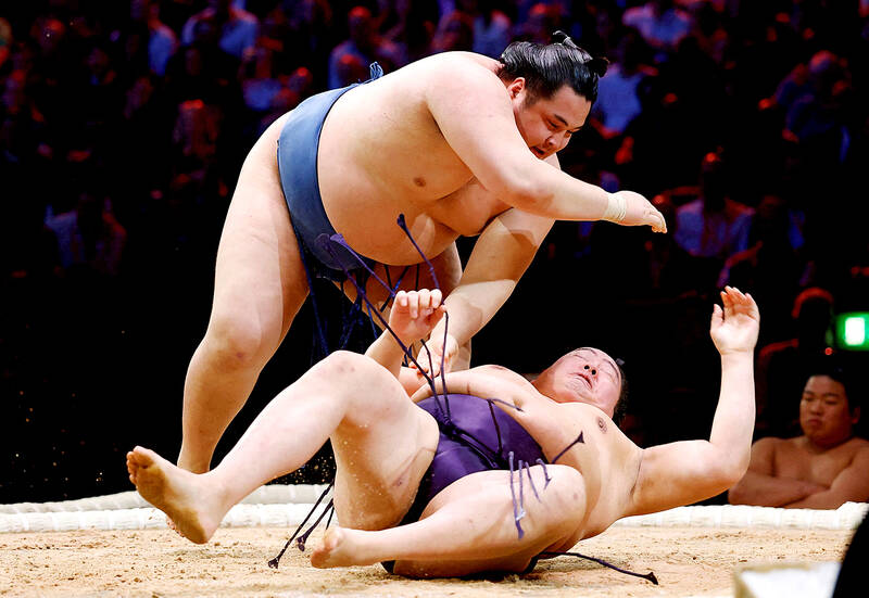 Spectators reveled in the sight of Midorifuji, the lightest wrestler in London at a mere 114kg going toe-to-toe with towering Kazakh fighter Kinbozan — who is 64kg heavier — before being lifted in the air and dumped outside the ring.