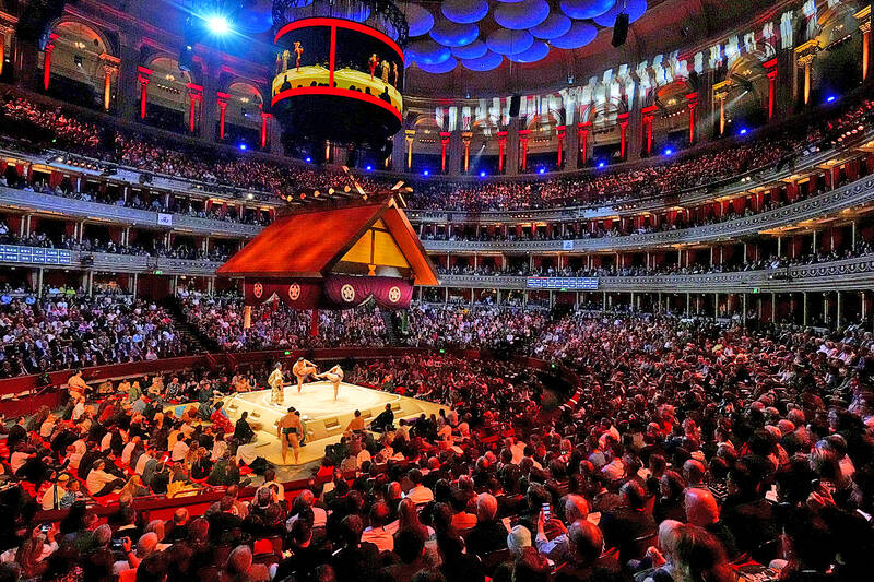 Japan’s elite sumo wrestlers slapped, thrust and flipped their way through the first evening of their five-day exhibition tournament at London’s Royal Albert Hall on Wednesday, to the delight of a full house of spectators.