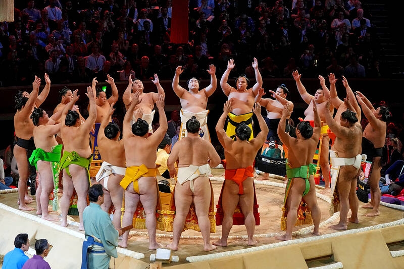 The event, the first such sumo match in the UK in 34 years, was aimed at promoting ties between the two countries, Japan Sumo Association chairman Hakkaku Nobuyoshi said.
