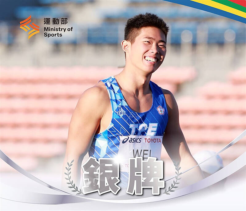 Wei finished second Tuesday with 5,985 points, giving Taiwan its first medal since An Ching-lung (安慶隆) competed in the same category and stood on the podium at every edition of the quadrennial competition from 2001 to 2009.