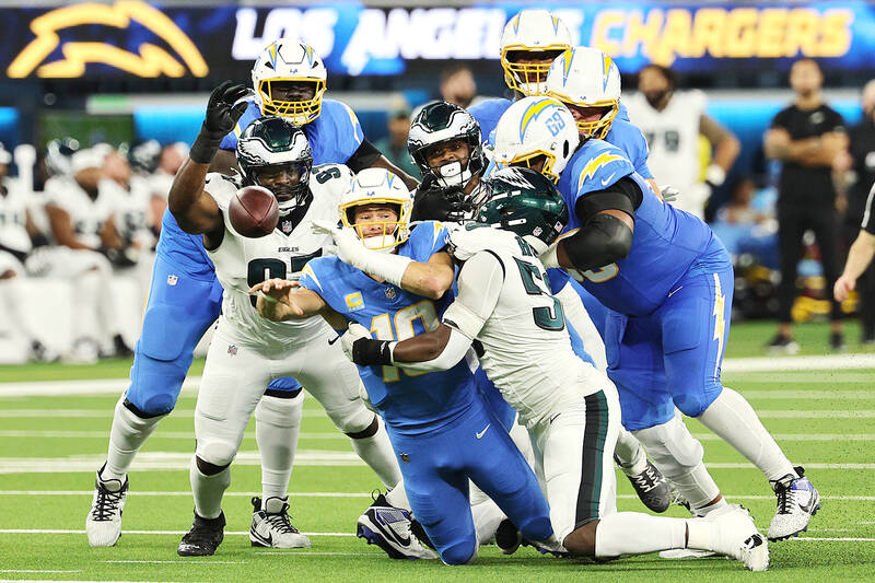 The Chargers defenders forced Hurts to throw four interceptions and surrender a fumble for a career-worst five turnovers as the Eagles fell to 8-5 with a third consecutive loss.