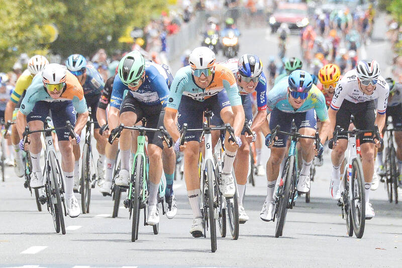 NSN rider Ethan Vernon, front, center, crosses the finish line to win the fourth stage of the UCI Tour Down Under in Adelaide yesterday. Vernon won a shortened stage in brutal heat, while Jay Vine remained on track to win the overall title. Decathlon CMA CGM’s Tobias Lund Andresen, second left, was second across the finish line in Willunga, with Laurence Pithie, third right, of Red Bull Bora Hansgrohe third. Vine overcame the loss of UAE Team Emirates teammate Jhonatan Narvaez in a crash early in the stage to protect his substantial lead in the general classification heading into today’s final stage with a 1 minute, 3 second buffer over Mauro Schmid of Team Jayco AlUla.