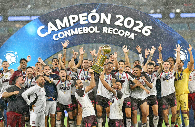 Lanus defender Carlos Izquierdoz, front left, and midfielder Eduardo Salvio, front right, hold the trophy as their teammates and support staff celebrate winning the CONMEBOL Recopa Sudamericana title against Flamengo at the Maracana Stadium in Rio de Janeiro on Thursday. Argentine club Lanus won the second leg 3-2 on Thursday after also winning the first leg 1-0 against their Brazilian opponents. The Recopa is an annual matchup between the champions of the previous season’s Copa Libertadores and Copa Sudamericana.
