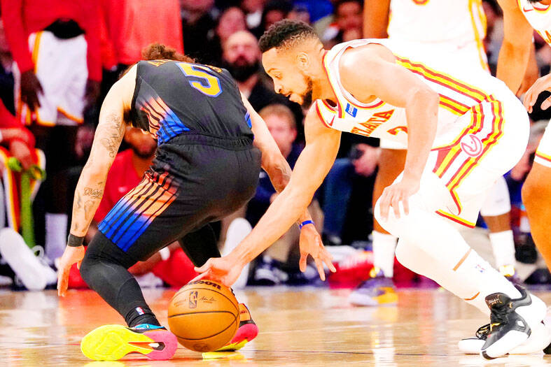 In New York, C.J. McCollum scored six of his game-high 32 points in the final two-plus minutes for the visiting Atlanta Hawks, who stormed back from an eight-point deficit in the last five minutes to stun the Knicks 107-106 in Game 2 of their Eastern Conference series.