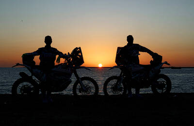 Zero Mileage Lubricant’s Zhao Hongyi and Zang Min are pictured with their motorbikes in the bivouac ahead of the Dakar Rally in Yanbu, Saudi Arabia, on Thursday. This year’s rally is to start today and consist of 14 days of racing across a prologue and 13 stages.