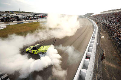 Robinhood Toyota driver Corey Heim celebrates with a burnout after winning the NASCAR Craftsman Truck Series Black’s Tire 200 at Rockingham Speedway in North Carolina on Friday.