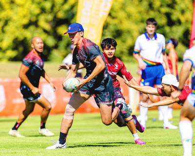 Taiwan’s Oliver Feuerhahn, second left, runs with the ball during their Men’s Pool A game against Singapore at the Asia-Pacific Opens Touch tournament in Mudgee, Australia, yesterday. Singapore kept the Taiwan men’s team winless at the tournament with a 19-5 victory after losses against Sri Lanka an