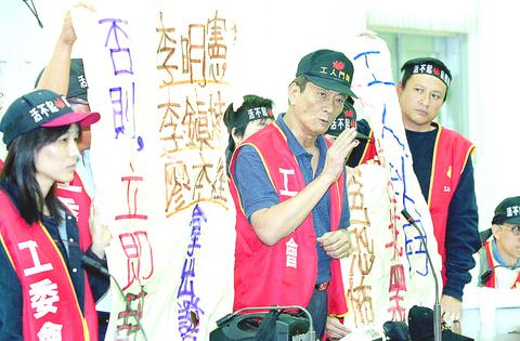 Some 20 members of the Committee for Action for Labor Legislation (工人立法行動委員會) went to the Legislative Yuan yesterday to demand that two DPP legislators who had accused organizers of a workers' demonstration of "working for China" to prove their accusations or resign.