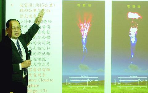 On July 22 last year, a team led by two physicists at National Cheng Kung University, Su Han-tzong (蘇漢宗) and Hsu Ruey-rong (許瑞榮), took high-resolution images of a rare "giant blue jet," which feeds energy from thunderstorms up into the ionosphere.