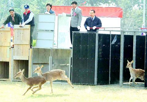 This was the fifth time since the park's inception in 1984 that park officials have released a group of the protected animals, which are bred in the park. Beginning with a herd of 22 pure-bred Formosan sika deer -- or cervus nippon taiwanus -- donated by the Taipei Yuanshan Zoo in 1984, Kenting park authorities have overseen the establishment of a herd of nearly 300 deer.