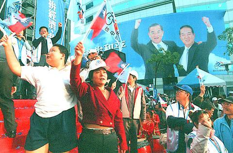 In a bid to avoid a repeat of their defeat in the 2000 presidential election, the leaders of the two major opposition parties, Chinese Nationalist Party (KMT) Chairman Lien Chan (連戰) and People First Party (PFP) Chairman James Soong (宋楚瑜), agreed in February to run together on a joint ticket in the upcoming presidential election.