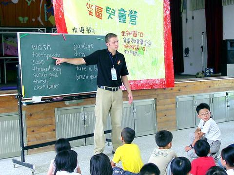 He sings and acts out the song patiently, exaggerating his movements for the children. The popular children's song is one of many activities of the English educational aspect of the foundation's Mindulle Relief Camp in Nantou County. The camp has been set up for children whose villages were devastated by Tropical Storm Mindulle early this month.
