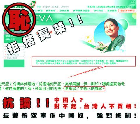 A picture of the EVA Airway official Web site, featuring a close-up of a paragraph mentioning "the pride of the Chinese people," was posted on the online forum of the pro-green newspaper South News on Wednesday. The author, identified only as "midigear," added to the picture in bold red lettering, "Protest! Chinese? Sorry, the Taiwanese won't pay the bill."