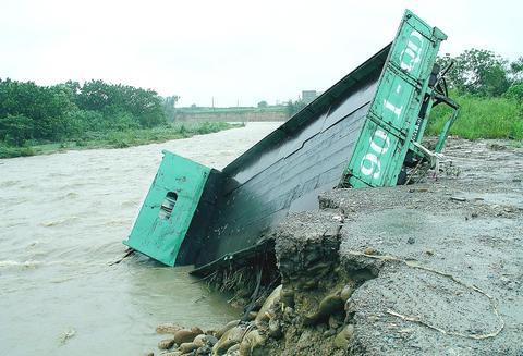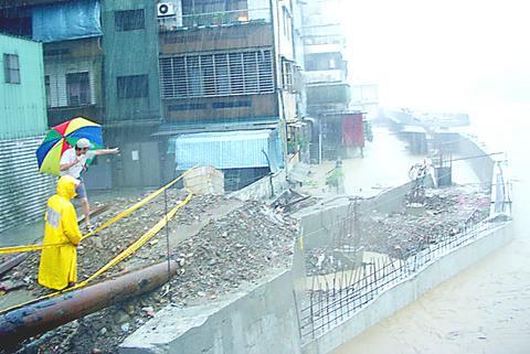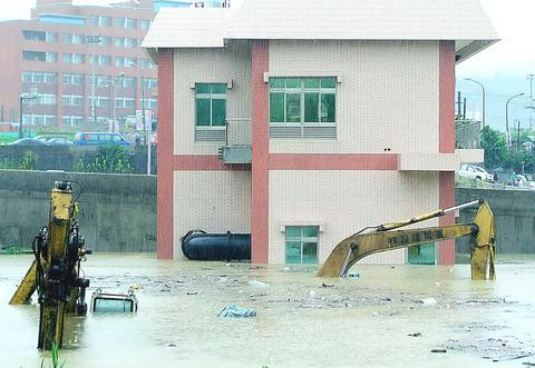 The overflow of water from nearby rivers inundated the newly built protection embankments in Tingnei, prompting Keelung City Mayor Hsu Tsai-li (許財利) to call on Minister of the Interior Su Jia-chyuan (蘇嘉全) to authorize the use of the Yuan Shan Tsai flood diversion sluice ahead of the facilities' completion.