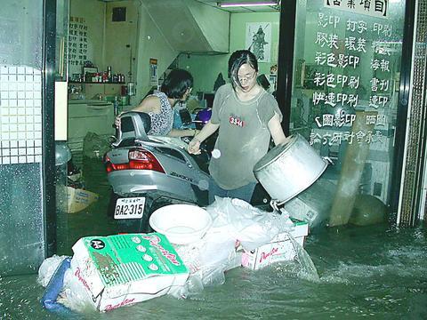 Later yesterday, flooding in the Taipei area subsided, and residents began to sweep mud out of their homes and shops.