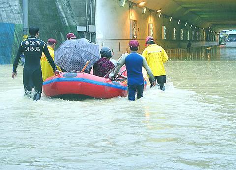 There was serious flooding on several Keelung City streets. The fire department was called on to assist with the evacuation of residents on Shenaokeng Road, where chest-high water levels forced one taxi driver to abandon his cab in the middle of the street.
