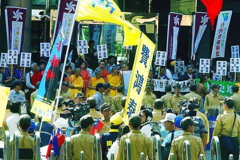 The pro-unificationists meanwhile held memorial wreaths used in Taiwanese funerals to express their "condolences" regarding the newly appointed head of the basic-level civil servant recruitment examination committee and Examination Yuan member Lin Yu-ti (