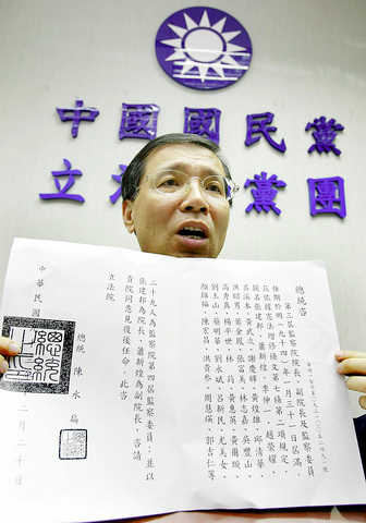 Huang also said it was suspicious that none of the current Control Yuan members involved in investigations dealing with the first family and the Taiwan High Speed Railway Co (THSRC, 台灣高鐵) were among yesterday's nominees.