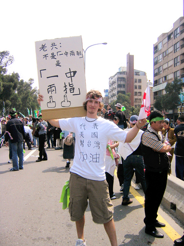 Walking alone in the crowd with a placard in one hand, a miniature flag in another, and a T-shirt with the Chinese-language slogan "Helping Taiwan on behalf of the United States," Jake Stevenson, a 22-year-old American from Washington, said that the "Anti-Secession" Law was a childish move by the Chinese government.