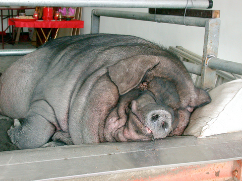 The belief that "the bigger the sacrificed pig, the more luck a person will have for the rest of the year" has resulted in a lifetime of agony for hundreds of pigs, bred by farmers to become abnormally overweight before slaughter, animal-rights activists said yesterday.