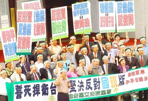 He said that while Taiwan should unite to face up to China's threat, especially in the face of Beijing's enactment earlier this year of its so-called "Anti-Secession" Law giving Beijing the "legal" option of taking Taiwan by force, the PFP and its political ally the Chinese Nationalist Party (KMT) have in fact been trying to supplicate China by coming up with the peace-promotion bill.