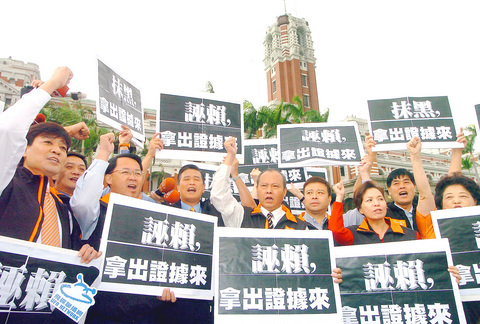 A group of PFP lawmakers staged a protest in front of the Presidential Office yesterday against the president's remarks and demanded that Chen provide proof of his allegations.