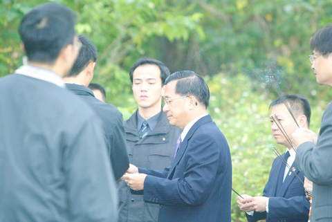 Accompanied by Huang's younger brother Huang Tien-fu (黃天福) and his widow, Democratic Progressive Party (DPP) Legislator Lan Mei-chin (藍美津), Chen visited Huang's tomb at a cemetery in Pali (八里), Taipei County.