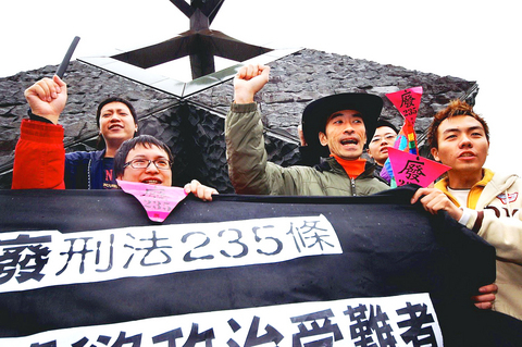 Gay rights activists yesterday gathered at 228 Peace Park and called for the abolition of Article 235 of the Criminal Law (