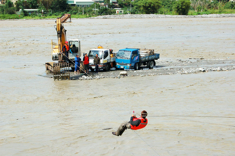 A surging river trapped seven workers carrying out dredging work at Shigang Dam. Their truck was washed away and they were forced to seek refuge on a sandbank.