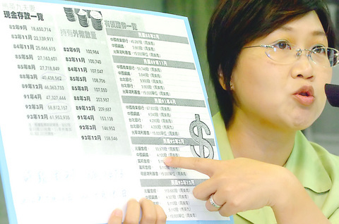 The councilors pointed out that the bank balances of Ma and his wife combined had increased by more than NT$40 million during the period 1993-2004 and claimed that the couple's assets increased most noticeably in the wake of the two elections.