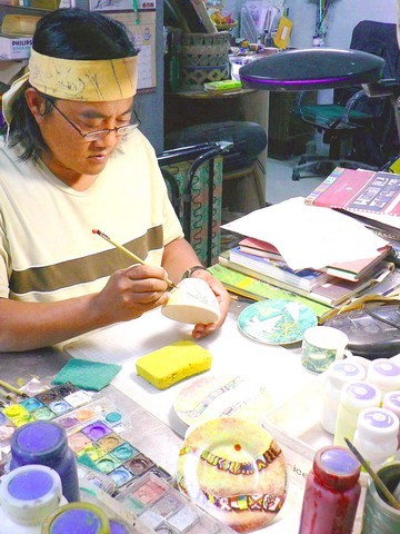 Therefore he has directed his efforts toward lamp shades with batik patterns, coffee cups, tiles and hanging decorations.